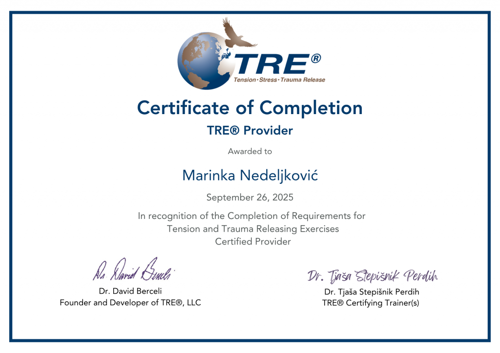 S TRE pristopom ustvarjamo prostor za globoko telesno sprostitev, ponovno povezovanje s sabo in občutek, da je telo lahko varen prostor. Uporaba TRE tehnike sproščanja ne zahteva nobenega posebnega predznanja, le pripravljenost, da prisluhnemo svojemu telesu.