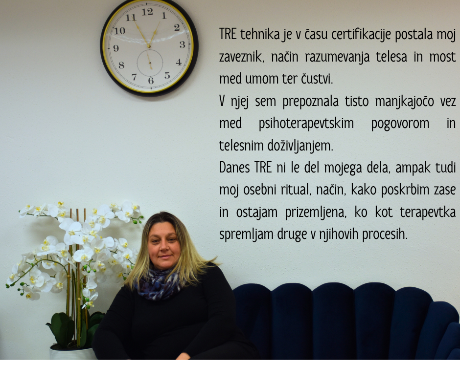 TRE® je inovativna serija vaj, ki pomagajo telesu pri sproščanju globokih mišičnih vzorcev stresa, napetosti in travme. Vaje na varen način aktivirajo naravni refleksni mehanizem tresenja ali vibriranja, ki sprošča mišično napetost in pomirja živčni sistem. Ko se ta mehanizem tresenja oziroma vibriranja aktivira v varnem in nadzorovanem okolju, se telo spodbuja, da se ponovno vrne v stanje ravnovesja.